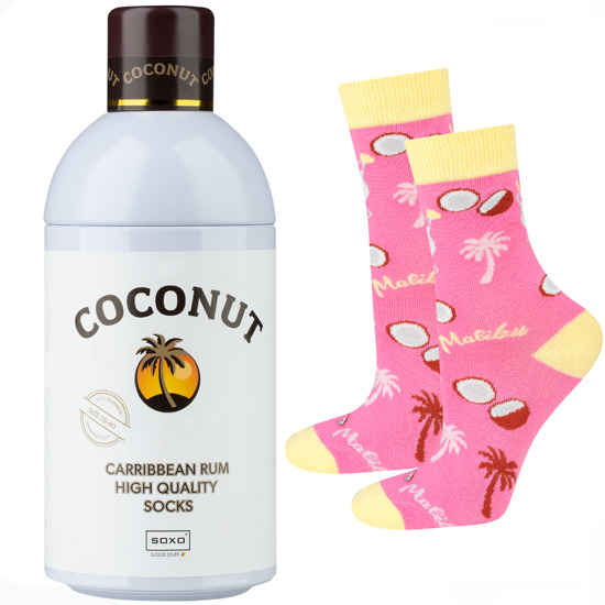 Este calcetín es un regalo original, que combina dos elementos distintos en uno, un par de calcetines con diseños de coco y una botella clásica de coctel en aluminio. Los calcetines que se encuentran en el interior de la botella son de un color llamativo, tienen un diseño fresco y tropical .Este calcetín es suave, cómodo y está hecho de materiales de alta calidad es un regalo ideal para alguien a quien le guste la moda y la fiesta, es una forma única y divertida de envolver un regalo. Con su combinación inesperada y su atractivo empaque, este regalo es una opción sorprendente y alegre que puede ser apreciado por cualquier persona.