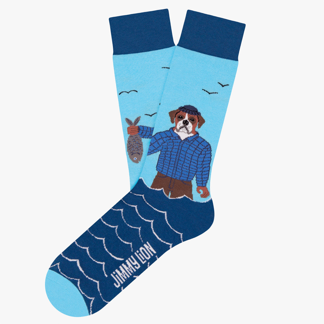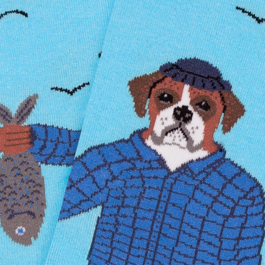 Estos calcetines de perro pecador son muy divertidos y originales que añaden un toque de humor y diseño. Sería un accesorio perfecto para un pescador aficionado o para alguien que busca calcetines con un estilo diferente. La mezcla de tonos azules del fondo, el detalle de las olas y la silueta de este perro pescador con su primera captura del día los hacen totalmente irresistibles. ¡No esperes más y consíguelo hoy mismo!