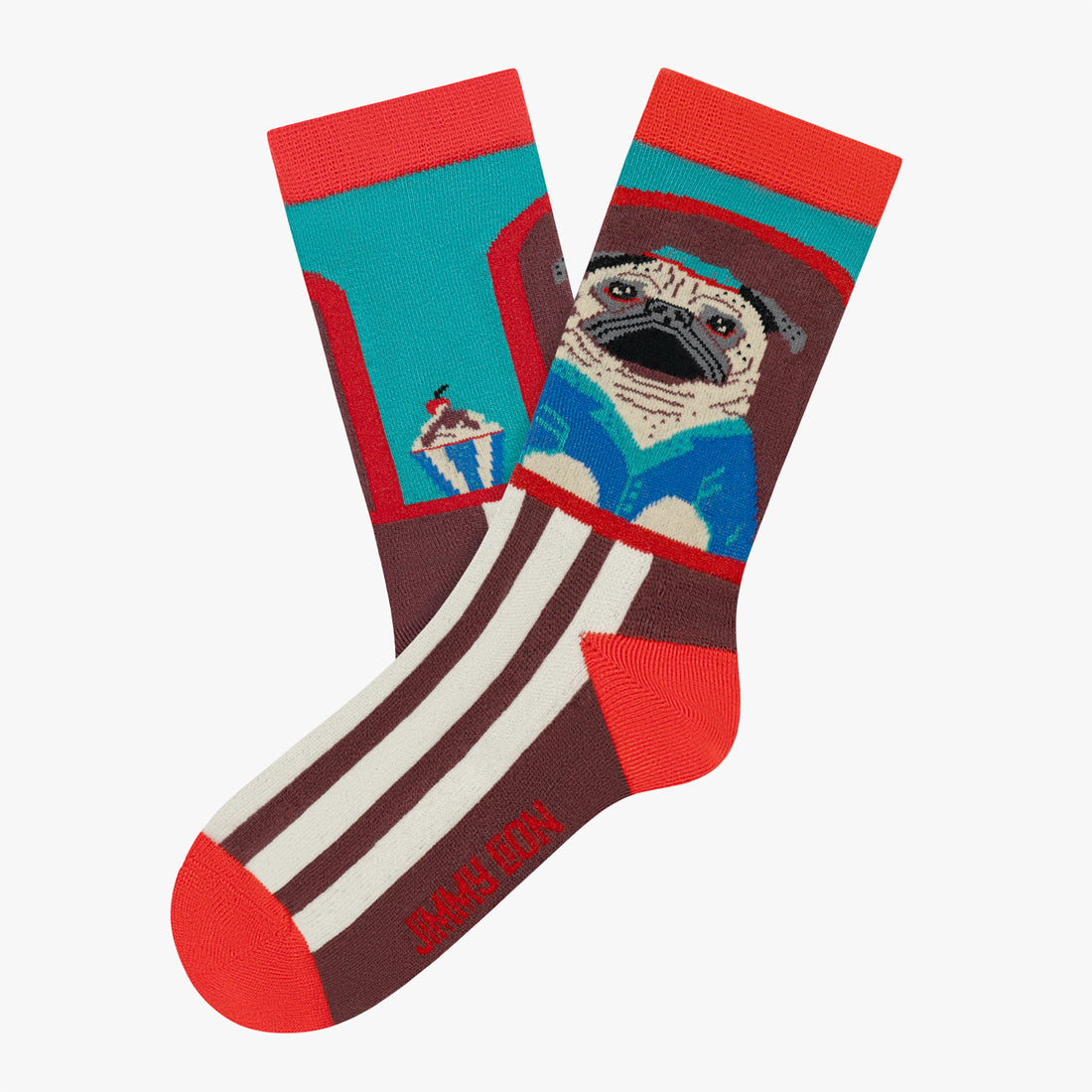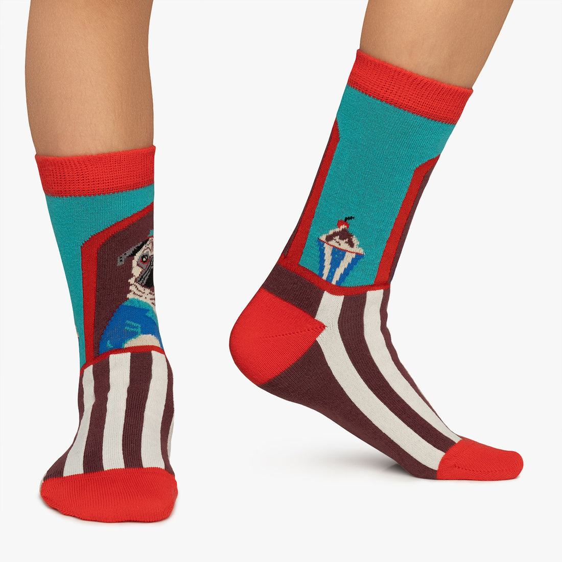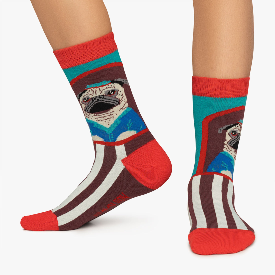 ¿Buscas calcetines divertidos para niños? Con este diseño y gracias al contraste entre el color turquesa del fondo con el rojo de la goma, talón y punteras y las franjas bicolores blancas y granates de la parte inferior, los más peques de la casa no pasarán desapercibidos. La cabeza de este original perro uniformado será el protagonista de todos sus looks y de sus tardes de juegos. Es difícil resistirse a este simpático animal y sobre todo, ¡a estos divertidos calcetines!