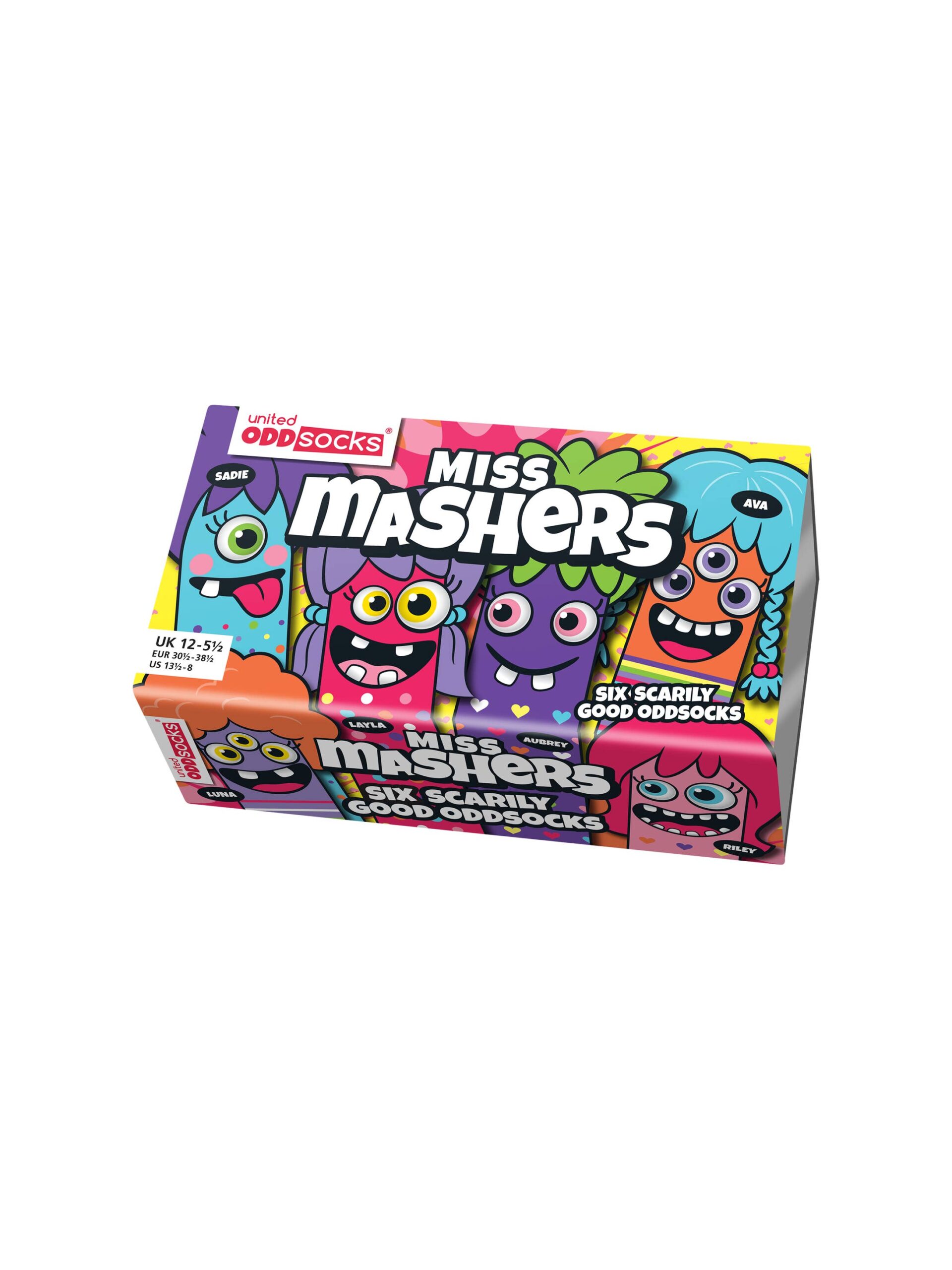 Al igual que sus hermanos mayores, los Masher, es posible que nuestras seis Miss Mashers no sean el grupo más bonito que hayas visto, pero podemos prometerte que son súper amigables. Y como cada Miss Masher tiene su propia personalidad única, puedes mezclarlas de 15 maneras diferentes para crear tus propios mash-ups de monstruos. Caja de seis calcetines desparejados (no seis pares) para que multipliquen la diversión con estos calcetines locos.