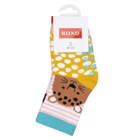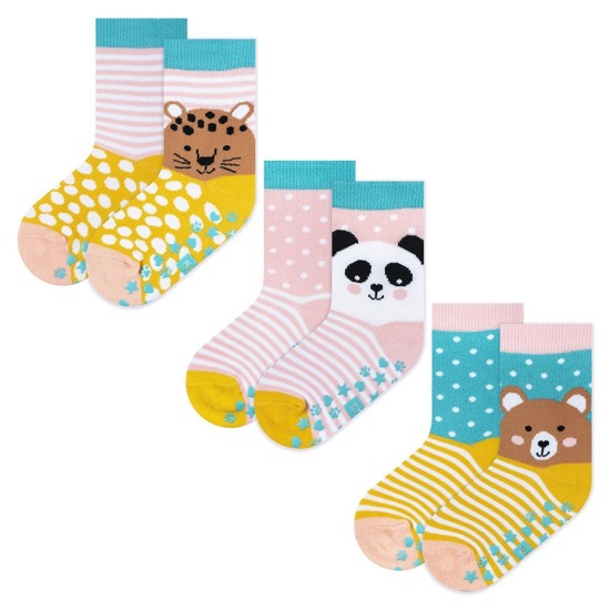 Un pack de tres calcetines para niñas con diseños de animales coloridos y tiernos. Cada calcetín tiene un animal diferente (gato, oso y lobo; azul, rosa violeta) o ( tigre, panda y lobo; amarillo, azul y rosa) Hechos de algodón suave y cómodos, perfectos para mantener los pies de los niños calientes y protegidos.