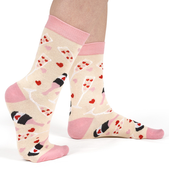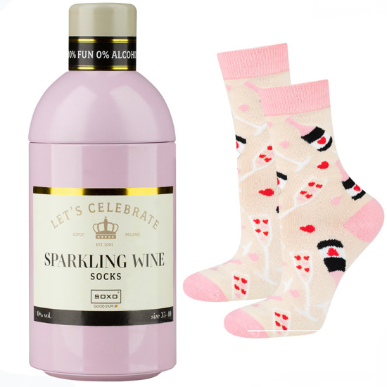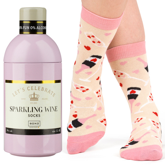 Este calcetín es un regalo original, que combina dos elementos distintos en uno, un par de calcetines con diseños de copas de vino fondo rosa y una botella clásica de coctel en aluminio. Los calcetines que se encuentran en el interior de la botella son de un color llamativo, tienen un diseño romántico y casual .Este calcetín es suave, cómodo y está hecho de materiales de alta calidad es un regalo ideal para alguien a quien le guste la moda y la fiesta, es una forma única y divertida de envolver un regalo. Con su combinación inesperada y su atractivo empaque, este regalo es una opción sorprendente y alegre que puede ser apreciado por cualquier persona.
