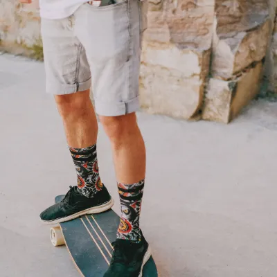 Este calcetín con estampado de lobo, dientes afilados y hojas de árbol simétricas es un calcetín con un diseño elegante y conectado con la naturaleza. Presenta un lobo con dientes afilados y una mirada feroz, El fondo del calcetín es un color oscuro y sofisticado, que complementa el estampado y añade un toque de misterio y elegancia. Este calcetín es suave y cómodo, y está hecho de materiales de alta calidad. Es una excelente opción para los amantes de la naturaleza y la moda, y puede ser usada para complementar una variedad de atuendos, desde casuales hasta formales. Con su combinación de estilo y comodidad, este calcetín es un accesorio versátil y lleno de vida que puede añadir un toque elegante y misterioso a cualquier atuendo.