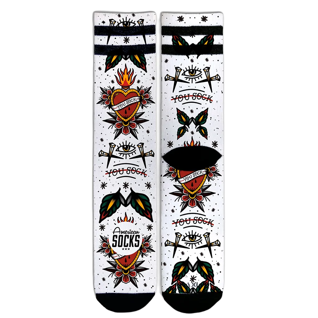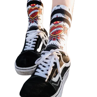 Un calcetín con un tatuaje de corazón en el medio es un calcetín de color blanco y negro con un diseño en forma de corazón en el centro. Este calcetín es suave y cómodo y puede ser usado en una variedad de ocasiones, como para un evento casual . Es un accesorio divertido y alegre que puede agregar un toque de amor a cualquier atuendo.